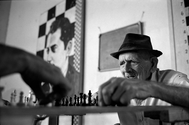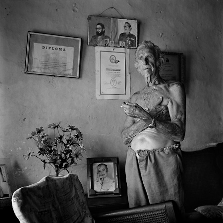 Однажды на Кубе, в Камагуэе, я заметил старика, курившего на пороге дома, и попросил разрешения снять его портрет. Он пригласил меня внутрь, вошел сам, встал рядом с креслом и продолжил курить, уйдя взглядом в пространство. Ему не пришло в голову надеть парадную рубашку, причесаться и улыбаться в объектив: ему было комфортно с самим собой, каким я встретил его, несмотря на растрепанные волосы и ослабшие складки кожи на обнаженном торсе. Старик не работал на камеру: он был свободен.