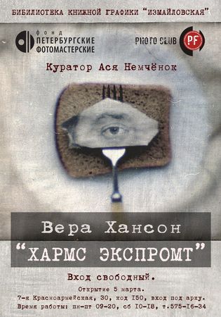 В работах Веры Хансон, которые вполне можно отнести к разряду современной сюрреалистической фотографии, экспериментальная техника удачно сочетается с парадоксальностью сюжета. И хотя каждая работа посвящена отдельному рассказу Хармса, это не иллюстрации, а скорее «игра в Хармса»- экспромт — попытка увидеть его сюжеты в наши дни своими глазами.