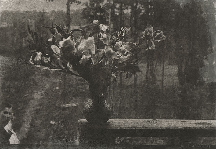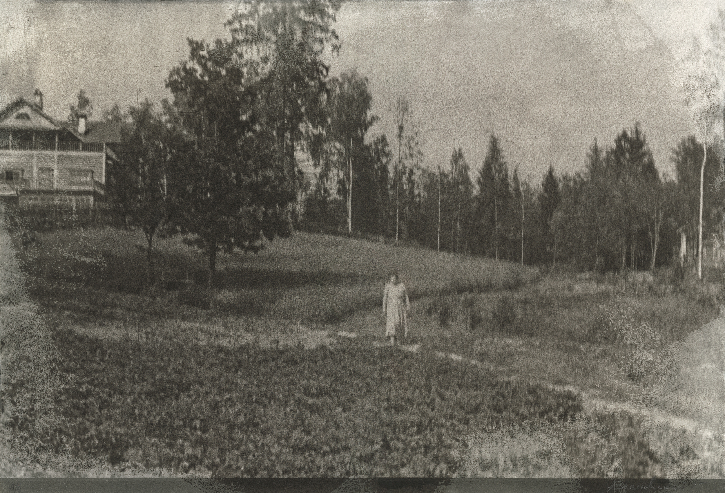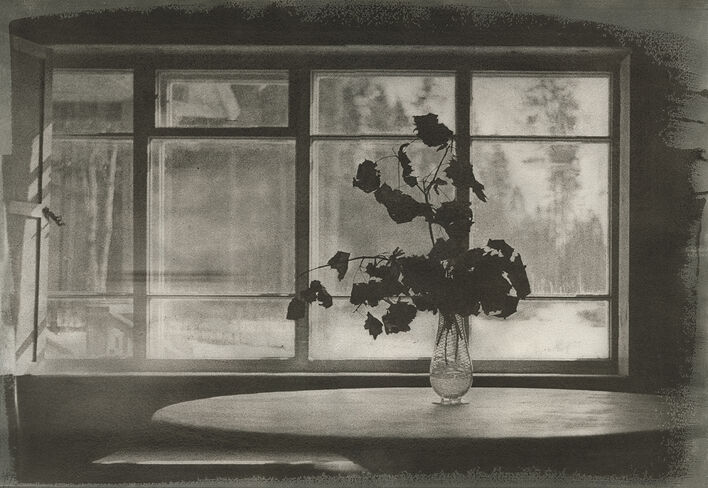 Изображения на отпечатках Алексея Веселовского слегка размыты, окутаны дымкой. Этот эффект ускользающих, но не проходящих бесследно воспоминаний художник создает с помощью гумбихроматной печати – одной из самых ранних фотографических техник. Чтобы проявить изображение, к фотобумаге, покрытой специальным светочувствительным раствором с содержанием пигмента, прикладывают негатив. Сквозь него проходит свет, и смесь затвердевает пропорционально полученному освещению. Затем отпечаток промывают, удаляя незастывшие частицы пигмента. Медленный, медитативный, почти алхимический процесс, как правило, подразумевает печать в несколько слоев для большей проработки полутонов и теней.
