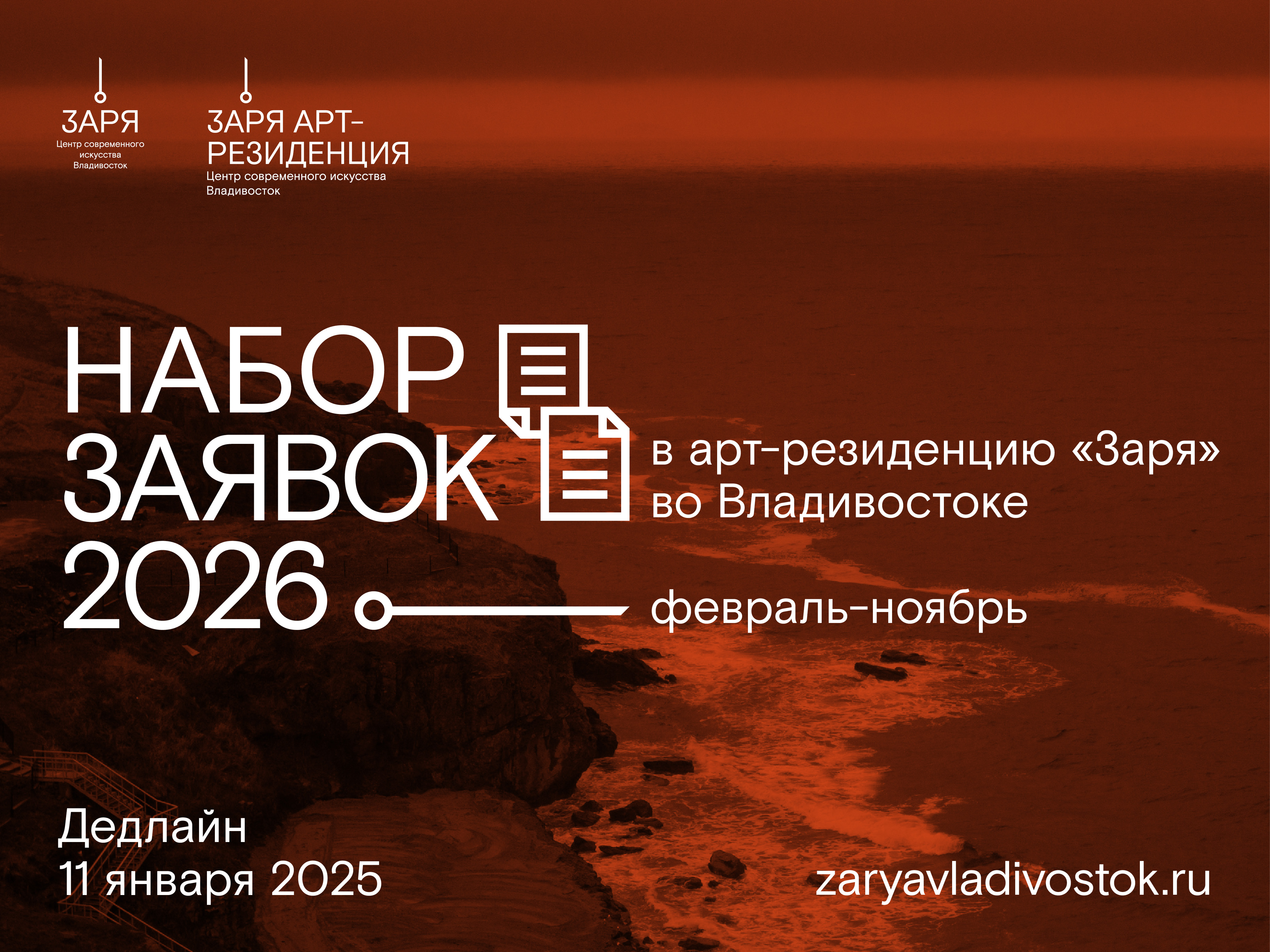 С дедлайном 11 января принимаются заявки на участие в круглогодичной арт-резиденции «Заря» во Владивостоке на 2026 год. Приглашаются художники, работающие в разных жанрах и техниках, фотографы и кураторы, а также писатели, историки, археологи, музыканты и междисциплинарные исследователи.