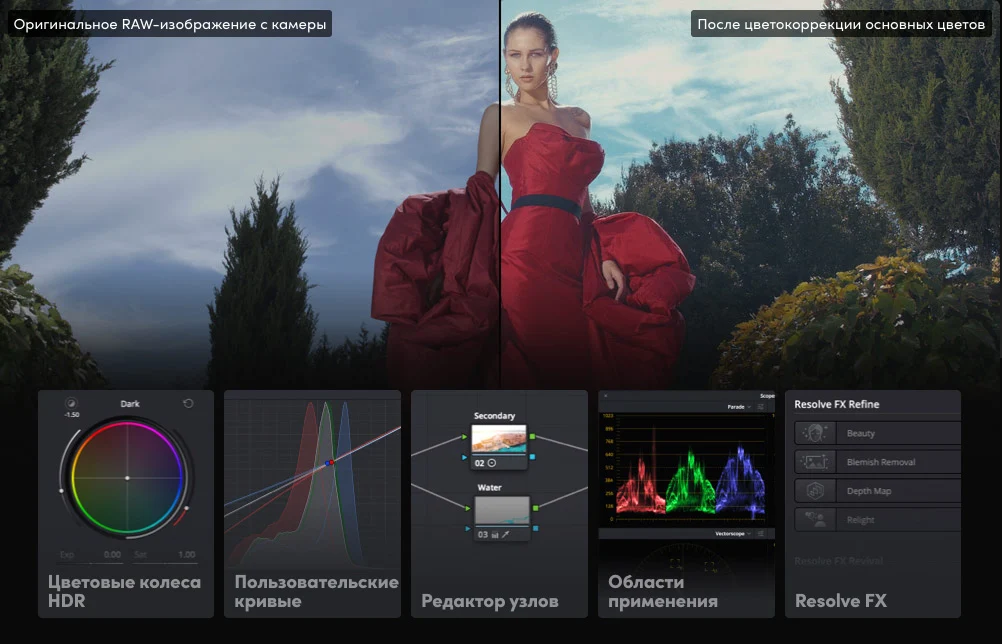 С нейросетевым обвесом одна оговорка. Magic Mask (вырезает объект одним щелчком), Face Refinement (отдельная правка глаз, кожи, губ), AI SuperScale (увеличение разрешения до четырёх крат), UltraNR (нейросетевое шумоподавление), Film Look Creator (имитация плёнки) – доступны только в платной Studio. В бесплатной версии Photo page остаётся полноценным фоторедактором: RAW на исходном разрешении, узловая цветокоррекция, кадрирование, альбомы, привязная съёмка для Sony и Canon, импорт каталога Lightroom. Только без нейросетевых надстроек.