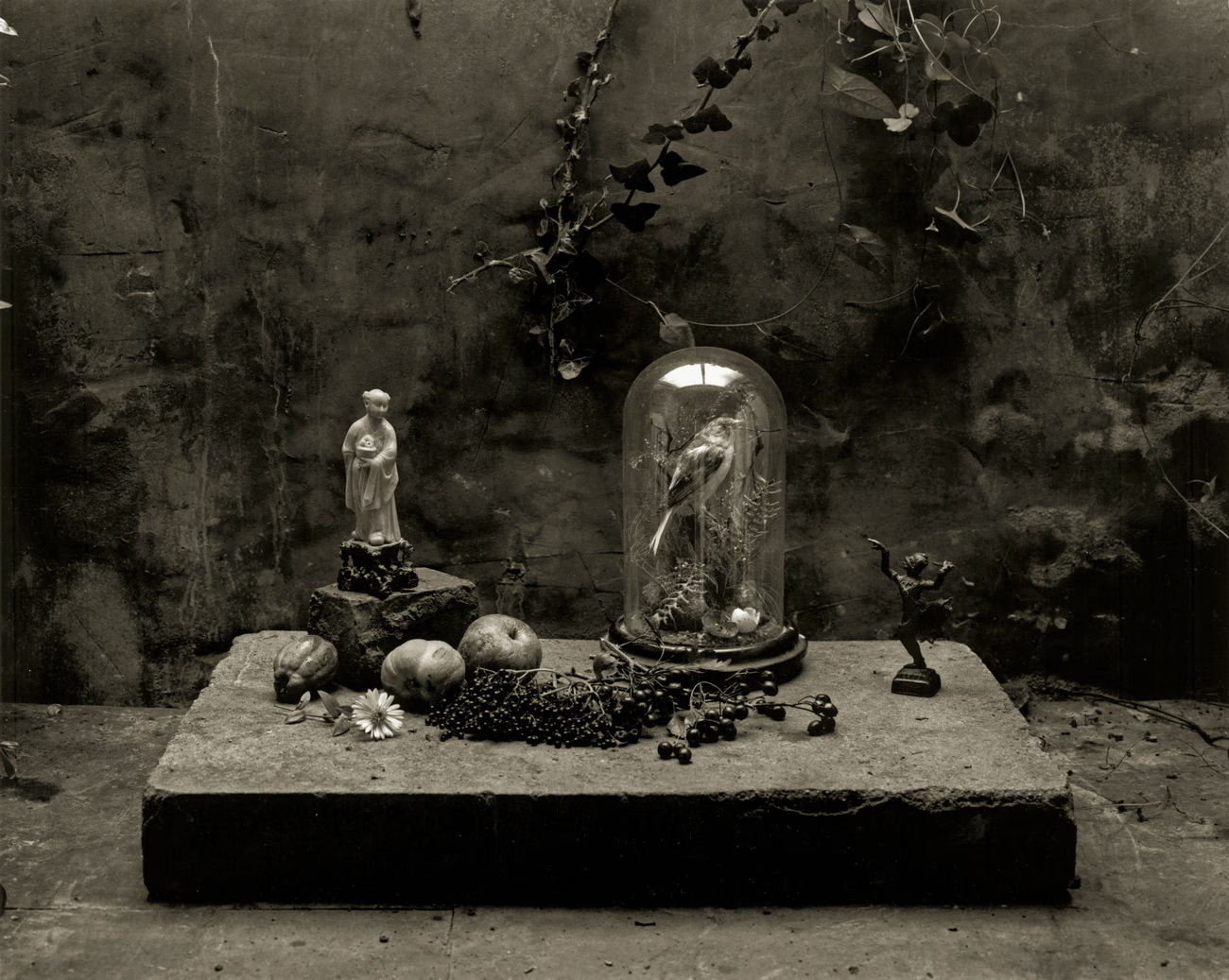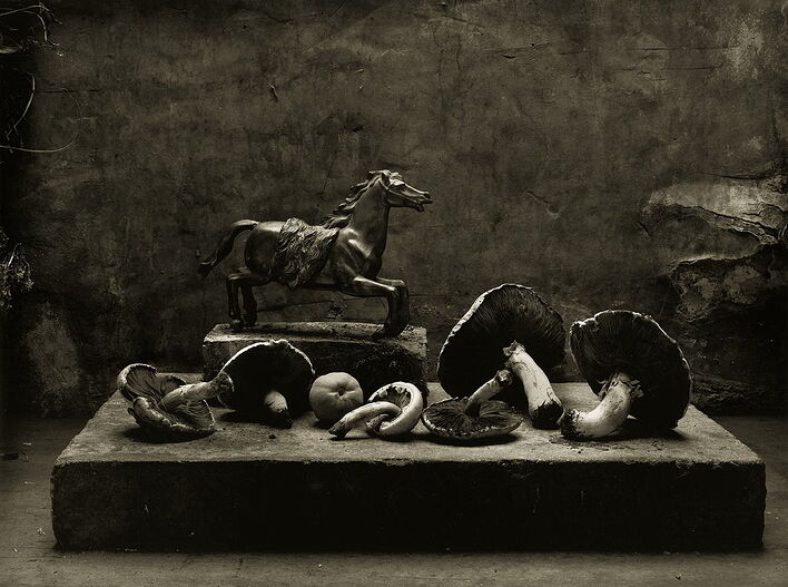 «Осенью я любил срывать ягоды с живых изгородей и бродить по полям в поисках тех же ягод, грибов и диких цветов, которые я мог бы аранжировать, словно на алтаре, вокруг моих любимых сувениров из путешествий, таких как бронзовые статуэтки из Азии. Вдохновляясь натюрмортами «малых голландцев» 16-го столетия, я старался создавать с помощью фотографии нечто подобное их холстам. В заброшенном садовом сарае я мазал стены сажей из дымохода, имитируя старинную патину, и создавал картину в скудном свете грязного окна».