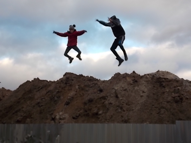 Во дворе стройка, мы прыгаем на песке