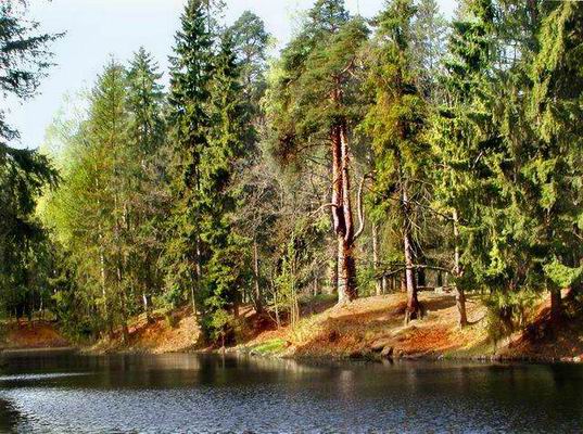 Ели и сосны на берегу.