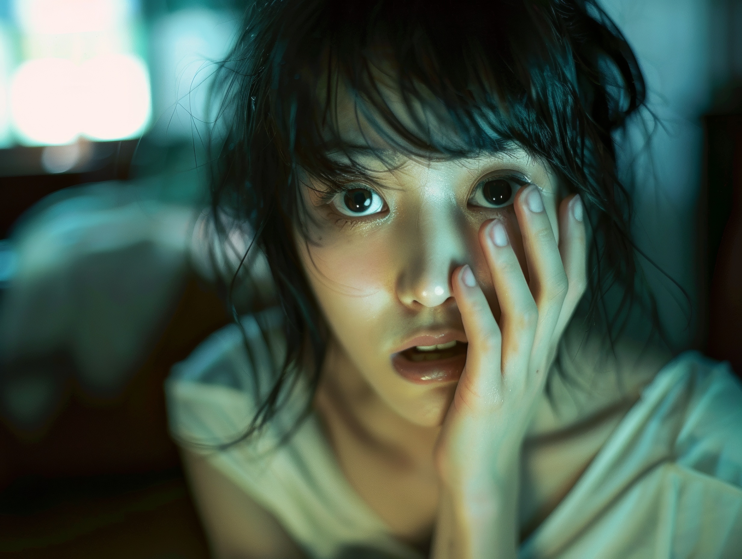 A medium shot of a beautiful young woman, hand covering her mouth in a gesture of surprise or silence, reminiscent of the provocative and intimate style of Nobuyoshi Araki. The composition focuses on her expressive eyes, hinting at a story untold, with the backdrop blurred to emphasize her figure. The lighting is natural yet dramatic, casting soft shadows that contour her facial features, adding depth and intensity to the scene. Her attire and surroundings, though not fully visible, suggest a casual intimacy, capturing the essence of Araki's approach to capturing the complexity and vulnerability of his subjects. --style raw --ar 4:3