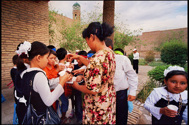 Хива: учитель раздает мороженое детям, приехавшим на экскурсию из кишлаков