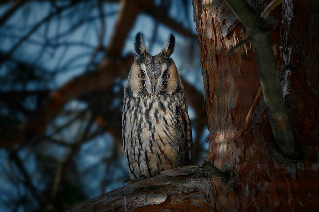 Сова ушастая зимним днём спит на сосне